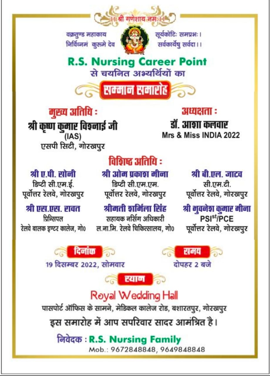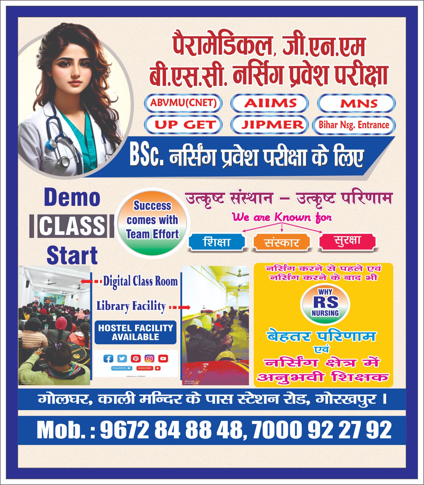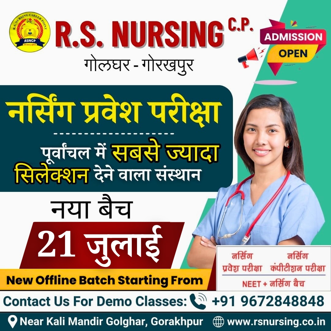 सपने देखना जरूरी है, लेकिन उसके लिए लगातार काम करना और भी जरूरी है, क्योंकि दुनिया में कोई जादू की छड़ी नहीं है जो सपने को हकीकत में बदल सके। आपको नर्सिंग क्षेत्र की सर्वश्रेष्ठ शिक्षा के साथ Skill Test की जानकारी देने के लिए हम हमेशा प्रतिबद्ध है। छात्र आज प्रबुद्ध और केन्द्रित है। वो जानते है कि वो क्या कर रहे है। उन्हें सिर्फ मार्गदर्शन की एक किरन की जरूरत है और मुझे गर्व है कि R.S. Nursing Career Point मार्गदर्शन कि वह किरण है जो आपके चेहरे पर उत्साह और मुस्कान का कारण बनती है।
